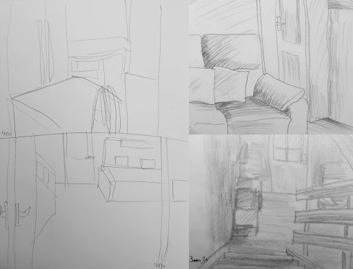 After you get more comfortable doing individual objects, it is time to start drawing scenes. You can start by walking around your house/flat and drawing the different views. Once again, at each scene, start with a small amount of time, maybe 30 or 40 seconds with a maximum of one minute.