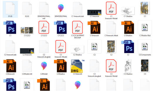 This process can take a long time depending on how much detail there is in your drawing and the amount of colours you’re going to be using. Remember to SAVE your work every now and then. I like to set reminders every half hour on my phone so that in case of errors, I don’t lose the entire colouring process. Illustrator may act up or lag in these cases so try and not have any other big programs running in the background. Once you’re done, you will reach a fully coloured stage. In this example, I’ve left out the background where the sky would be and the insides of the apartments because this is part of my post-production.