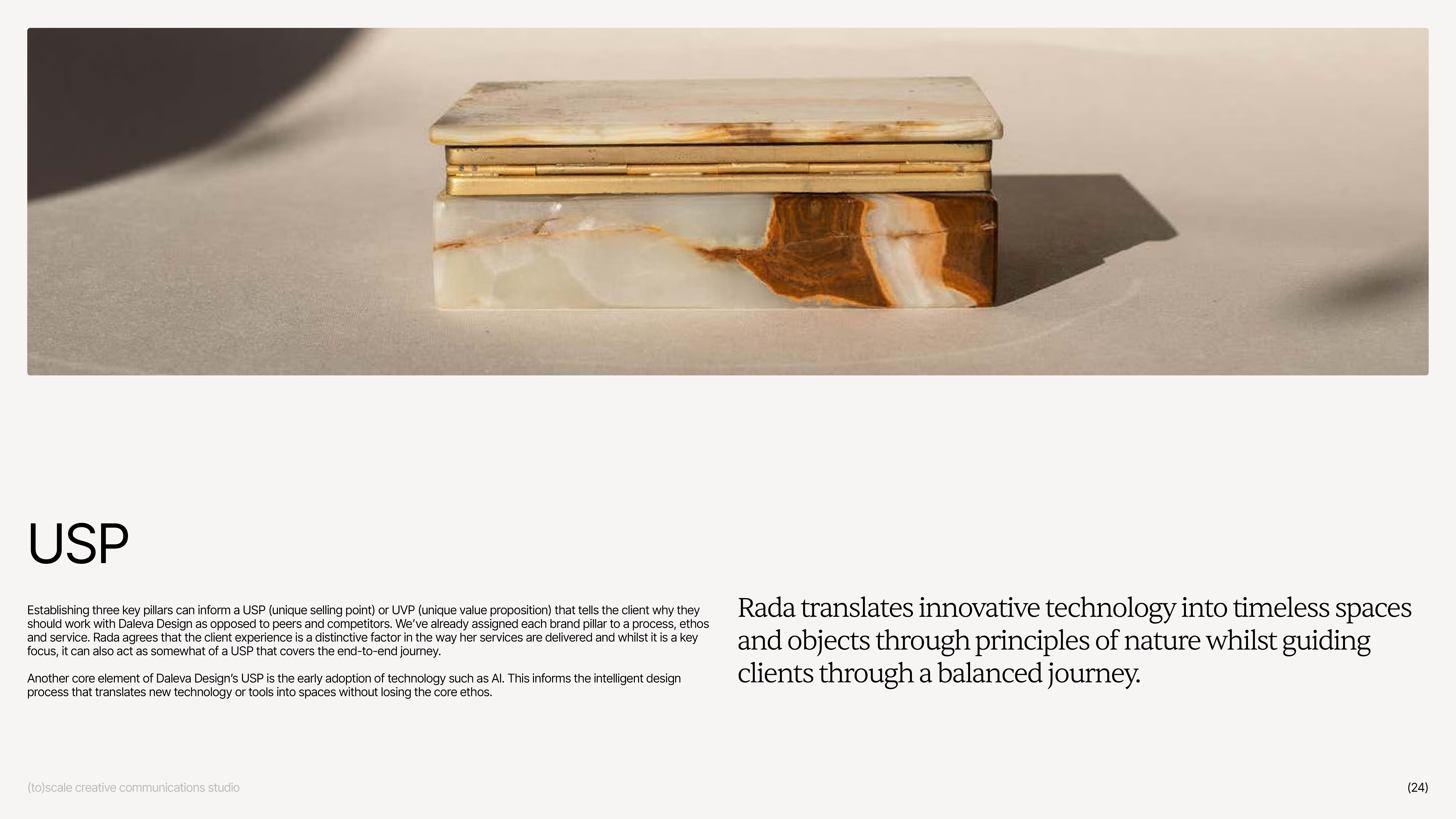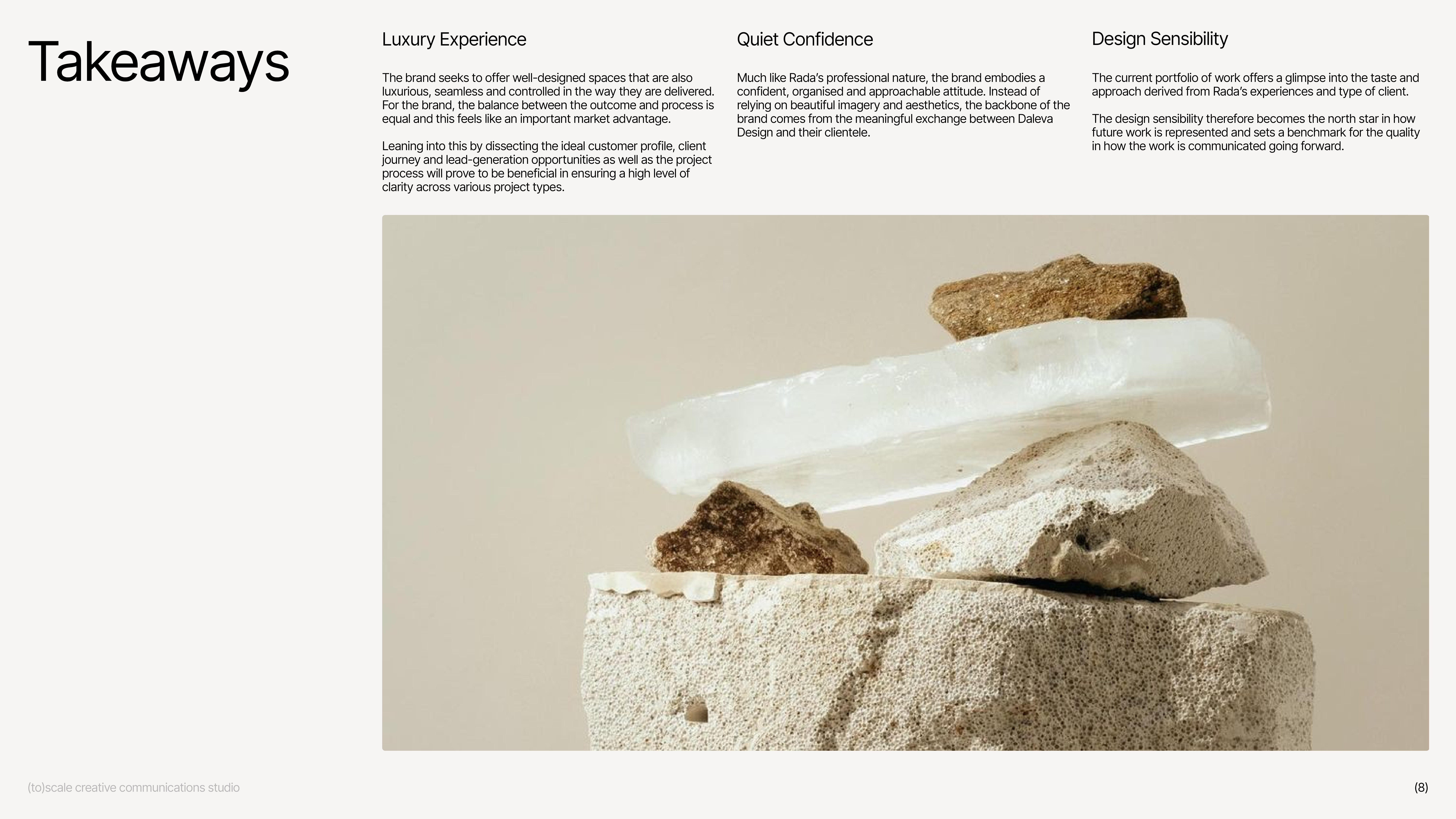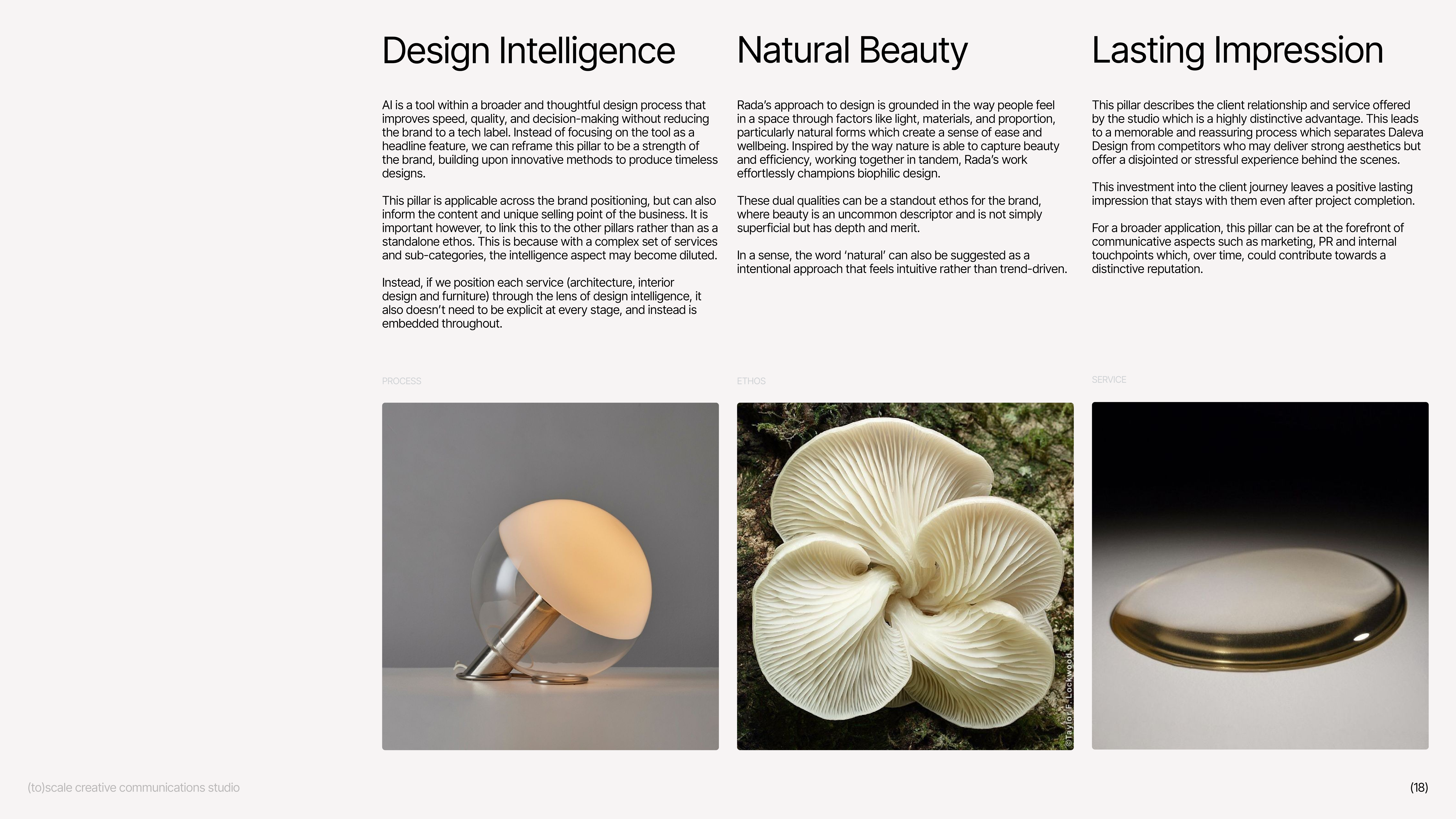 To assess the current positioning, I completed a digital audit that looked at the brand presence as well as Rada's personal credibility. Having identified the direction of the brand and its services, we worked to distill 3 core pillars for the brand that covered a design ethos, method of working and service.