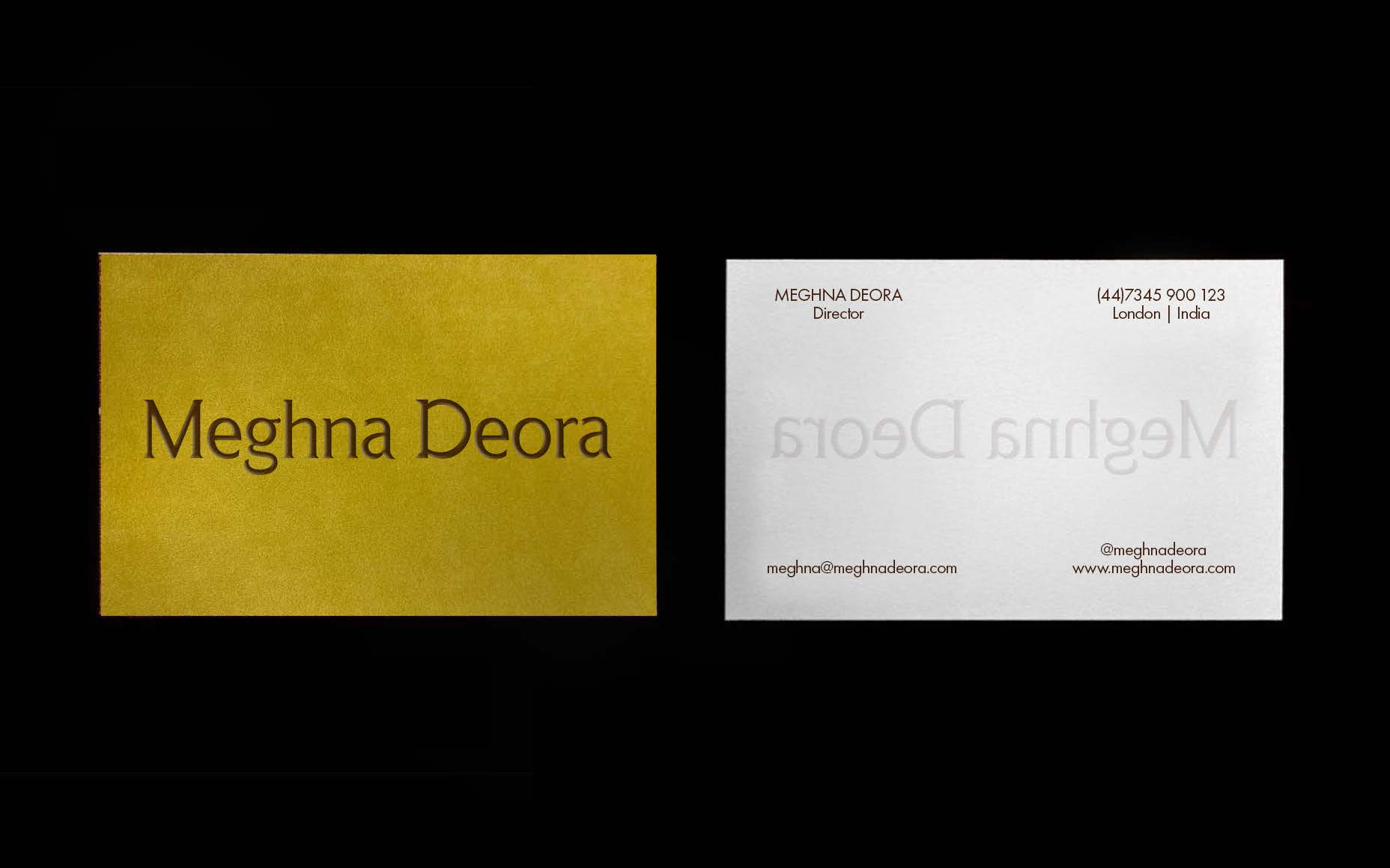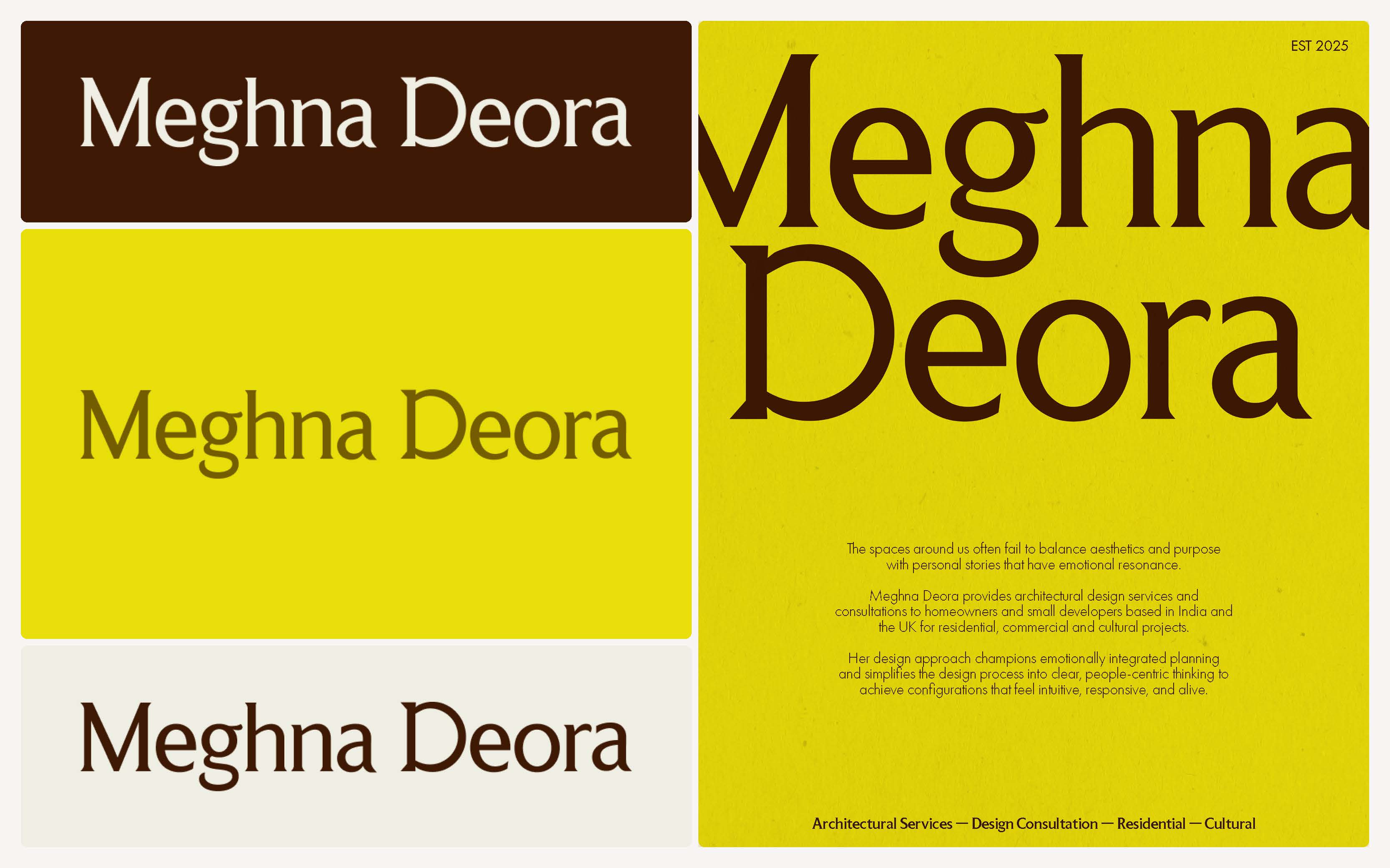 Providing a refreshed identity for solo practitioner, Meghna Deora, which speaks to the material-forward nature of her projects based across India and the United Kingdom.