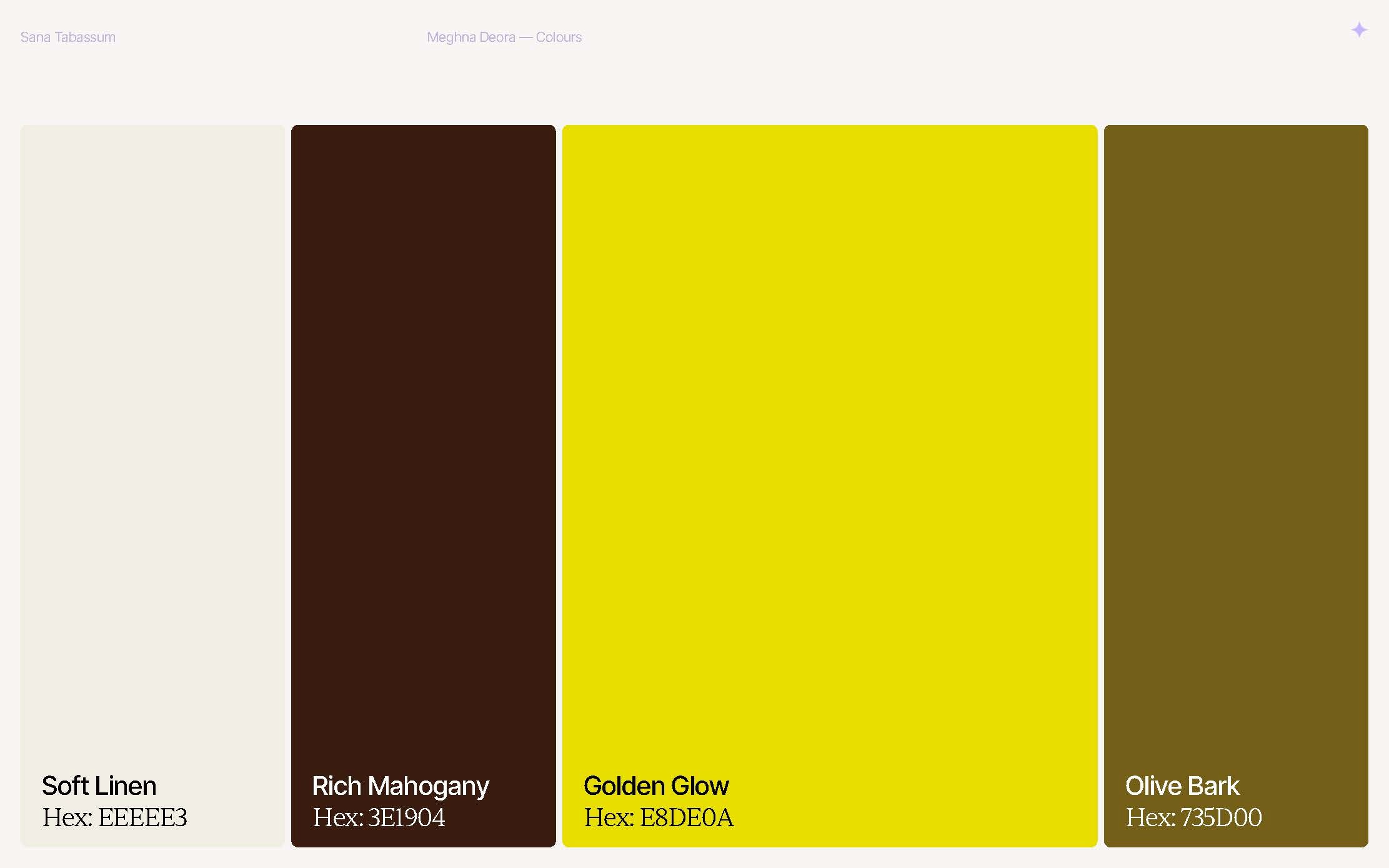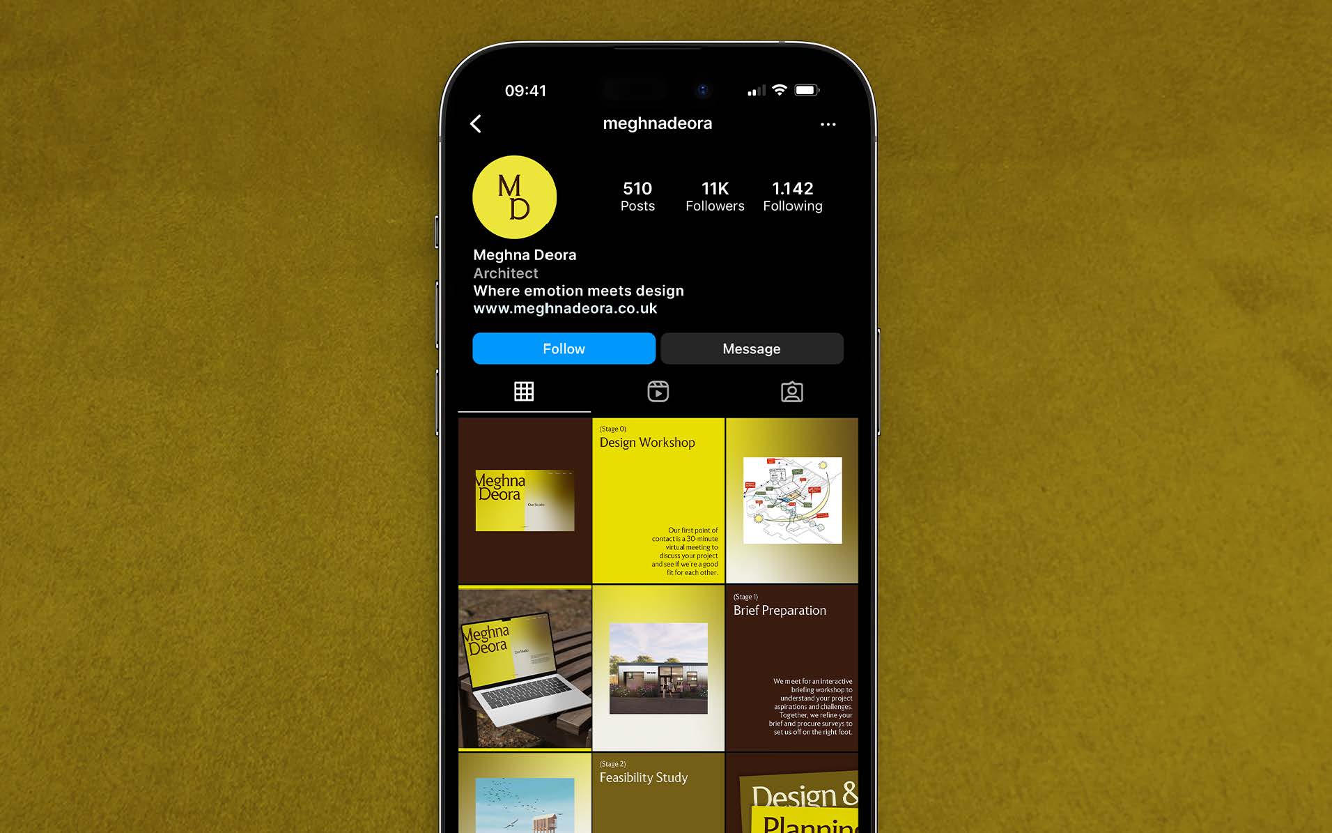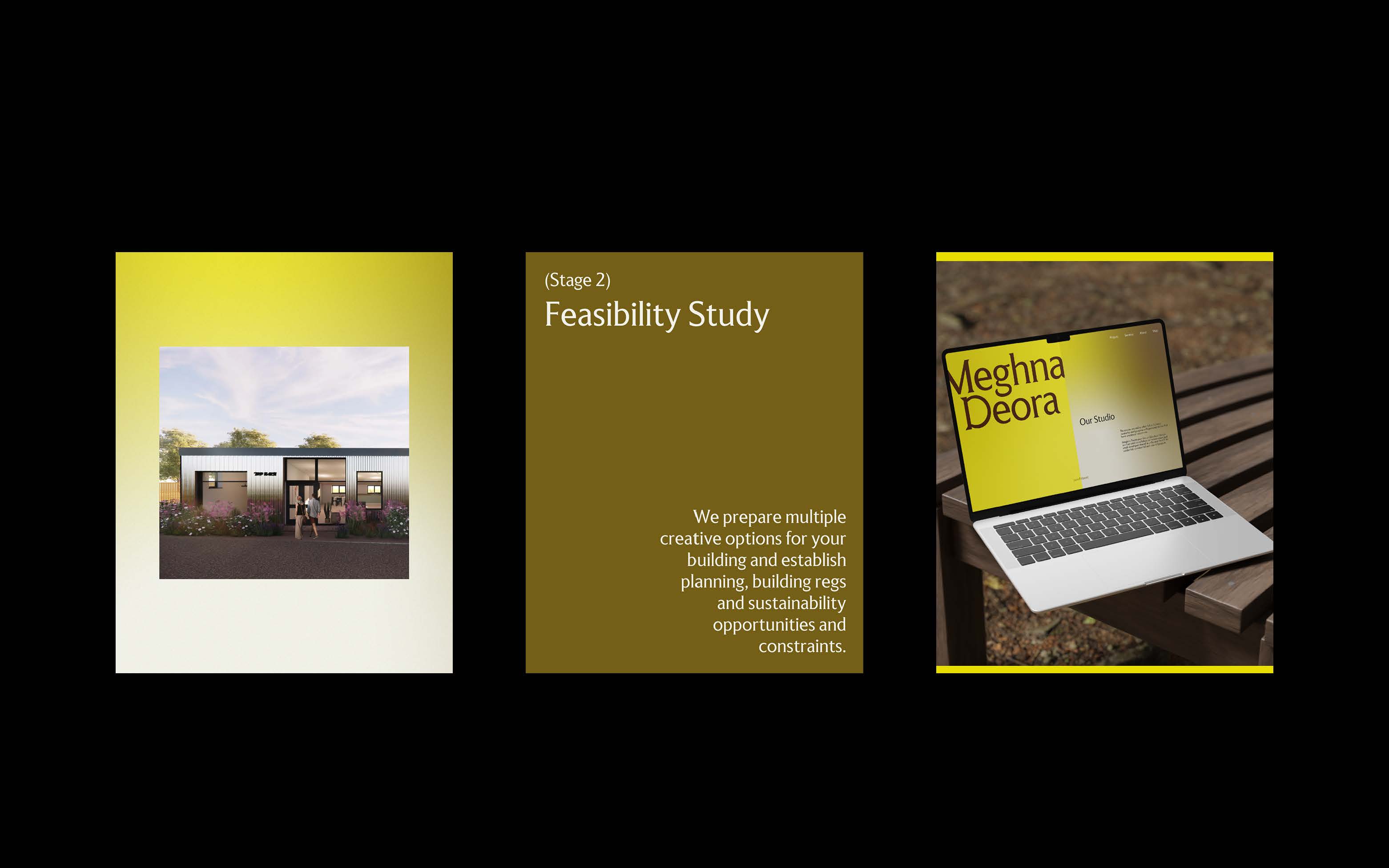 This visual identity also involved an exercise in understanding the brand tone of voice and how this complements Meghna's personal brand. Following this, I was able to design a bespoke typemark that offers a luxurious yet approachable feel to the brand. Inspired by textures and building materials, the mookdboard developed included warm shades such as an olive green and brown.