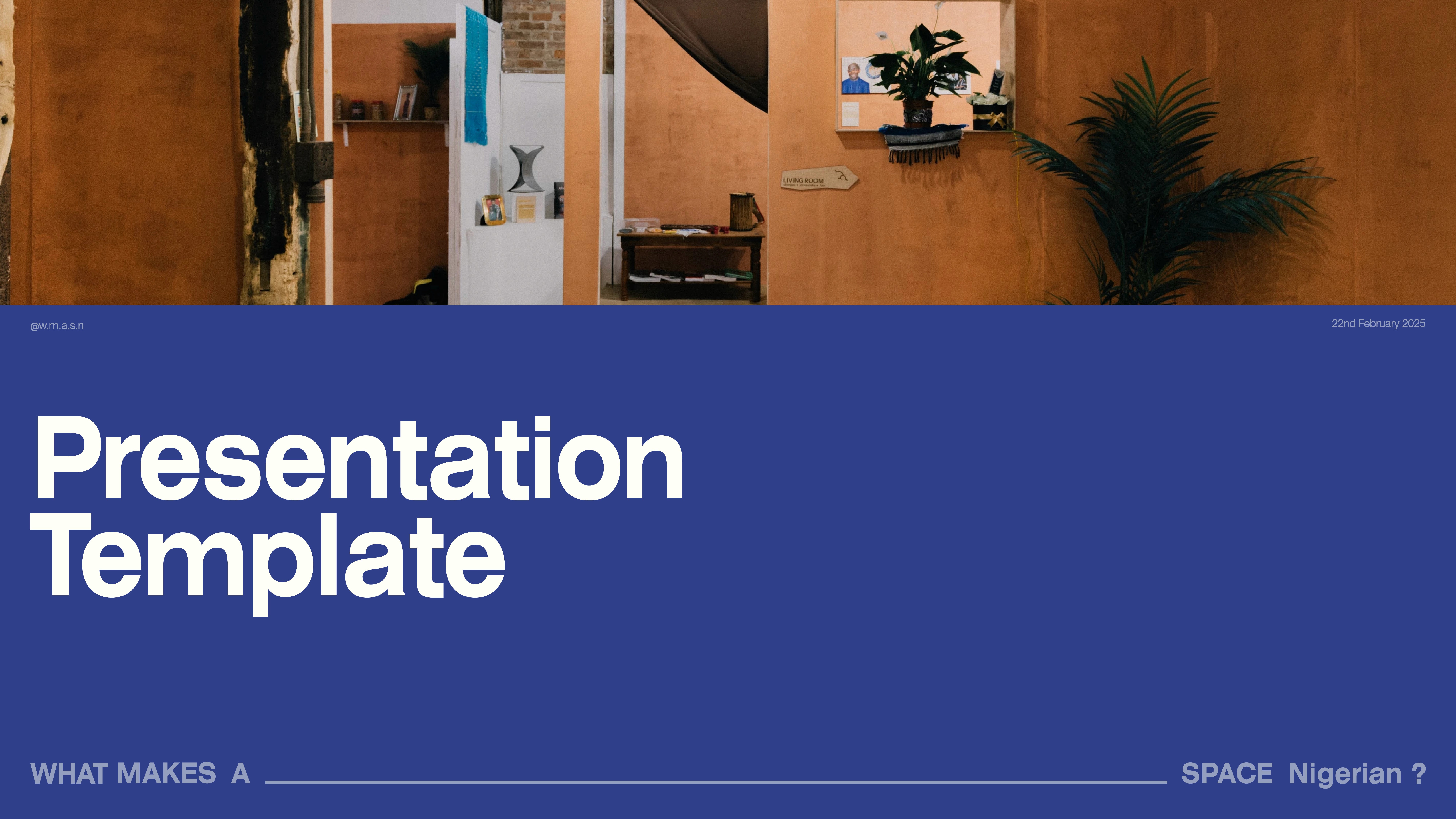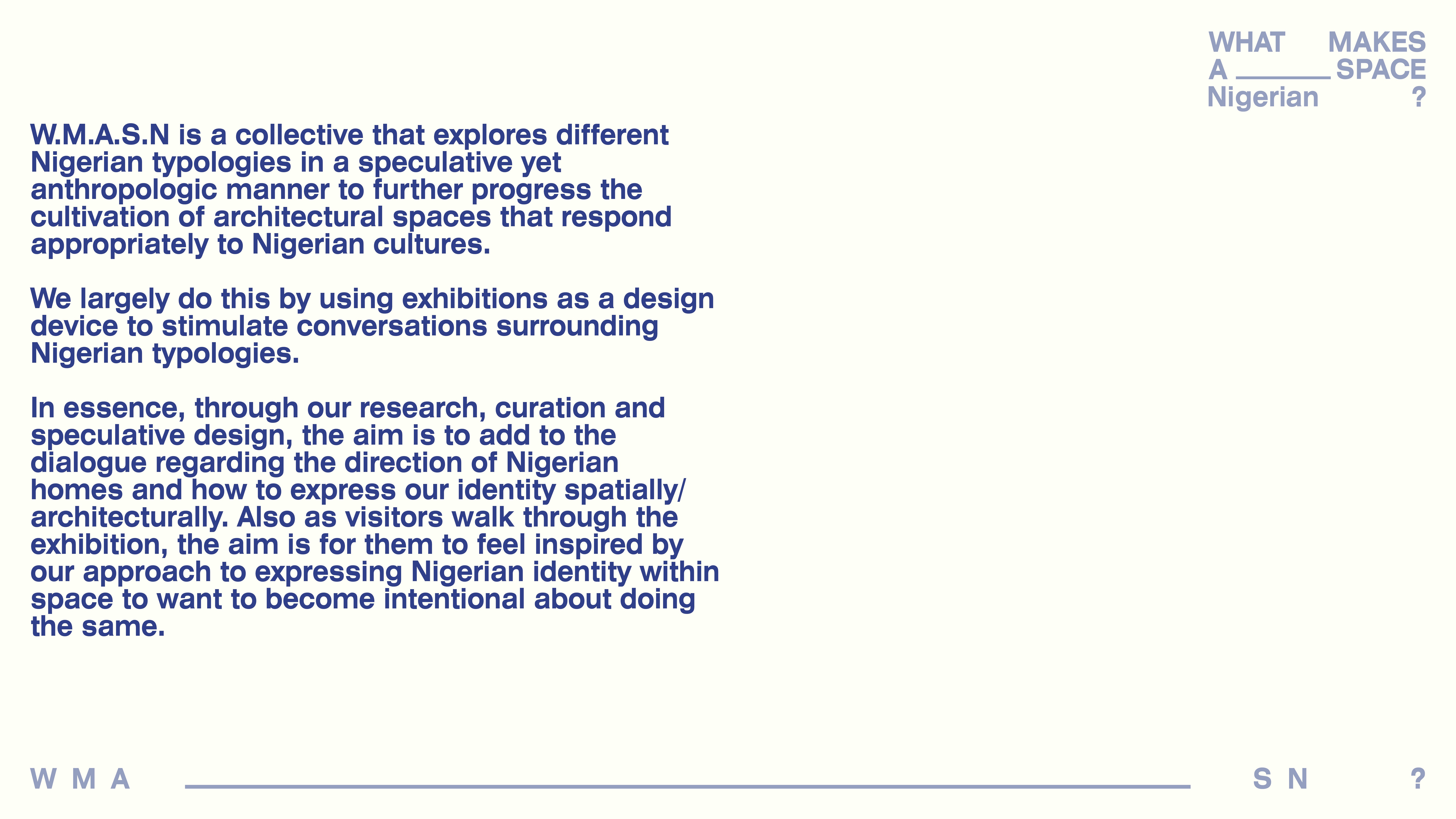 The exhibition, What makes a space Nigerian? interrogates the key components of the Nigerian cultures and histories that define the spaces we inhabit. For this project, I developed two presentation templates, building on the existing brand identity of WMASN, including a logo and colour palette. Whilst the client wanted future documents to feel bespoke, a streamlined approach to the brand stationary was needed to ensure a cohesive outlook.